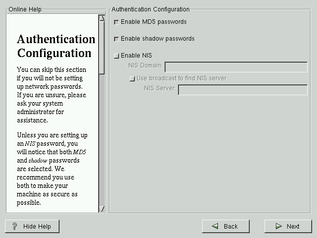 Unless you are setting up NIS authentication, you will notice that both MD5 and shadow passwords are selected (see Figure 6-13). We recommend you use both to make your machine as secure as possible.
