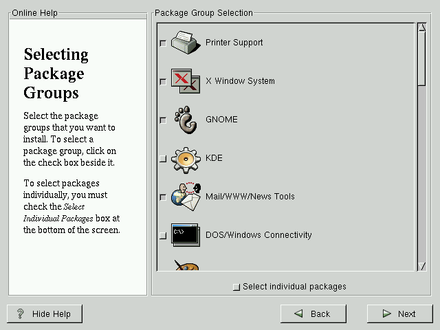 Some packages (such as the kernel and certain libraries) are required for every Red Hat Linux system and are not available to select or deselect. These base packages are selected by default. |