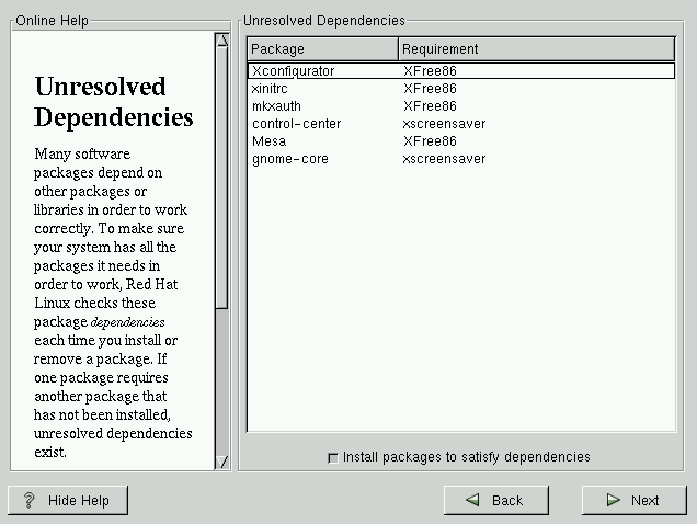 The Unresolved Dependencies screen will only appear if you are missing certain packages that are needed by your selected packages. Under the list of missing packages, there is an Install packages to satisfy dependencies check box at the bottom of the screen which is selected by default. If you leave this checked, the installation program will resolve package dependencies automatically by adding all required packages to the list of selected packages.