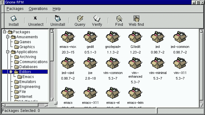 You can install, upgrade or uninstall several packages with a few button clicks. Similarly, you can query and verify more than one package at a time. Because of Gnome-RPM's integration with GNOME, you can also perform installation, query and verification on packages from within the GNOME File Manager.