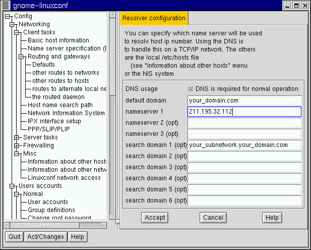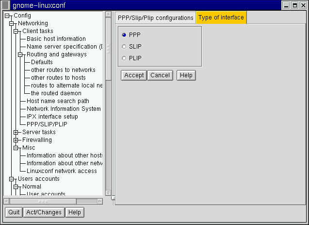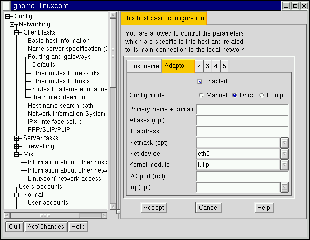 This document will display linuxconf screens using the gnome-linuxconf interface, but you shouldn't have any trouble using the other interfaces with the instructions provided here.