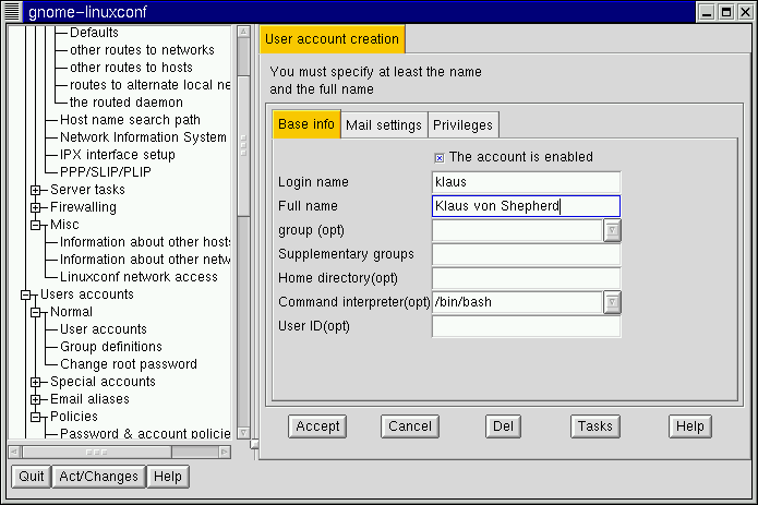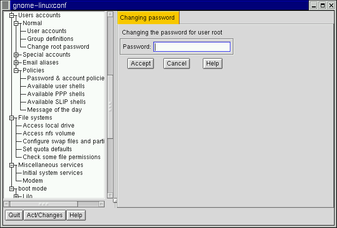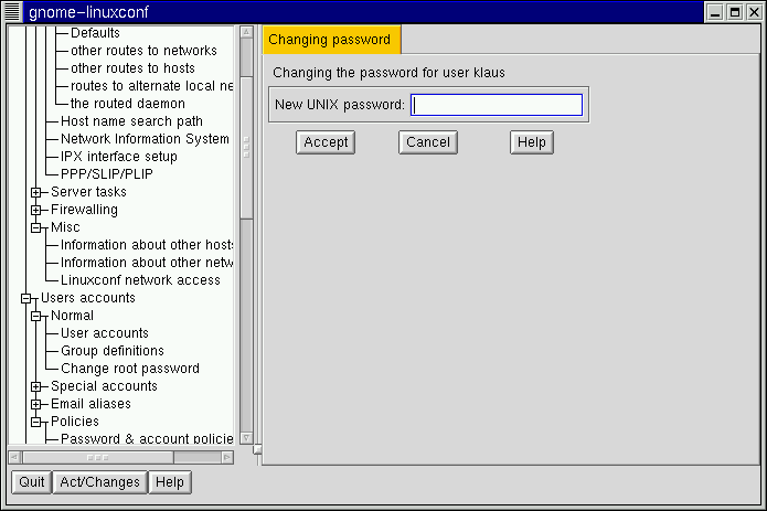 Linuxconf will prompt you to enter the new password. There is also a field called Confirmation where you will need to type the password again. This is to prevent you from mistyping the password. See the section called Adding a User Account for guidance on choosing a password. If you decide against changing the password, select Cancel. Once you have entered the new password select Accept.