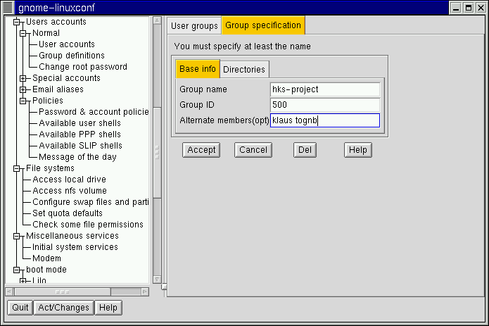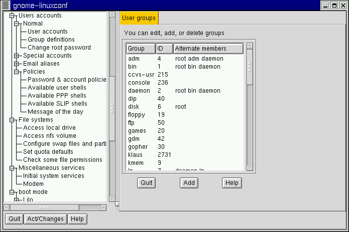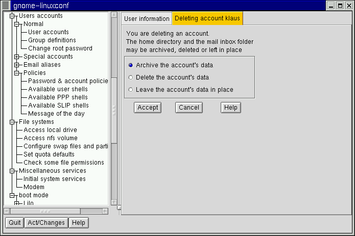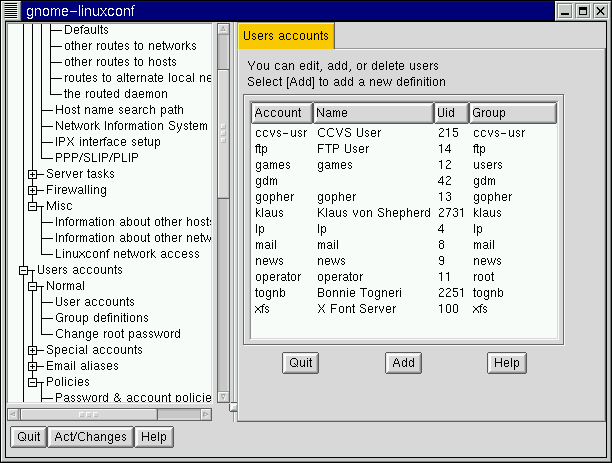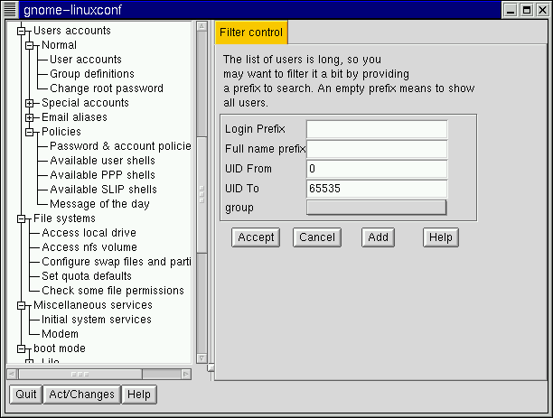 Open Config => Users accounts => Normal => User accounts. Linuxconf may show you a filter screen (see Figure 3-2).