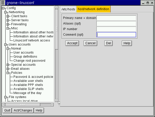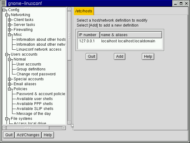 This chapter will go into detail on just a few of linuxconf's capabilities. If you just need a quick reference to show you where to go in linuxconf for the tasks covered by this chapter, see the section called Finding Your Way Through linuxconf.