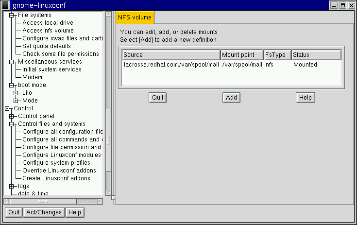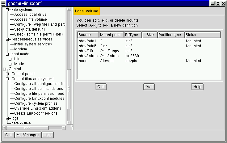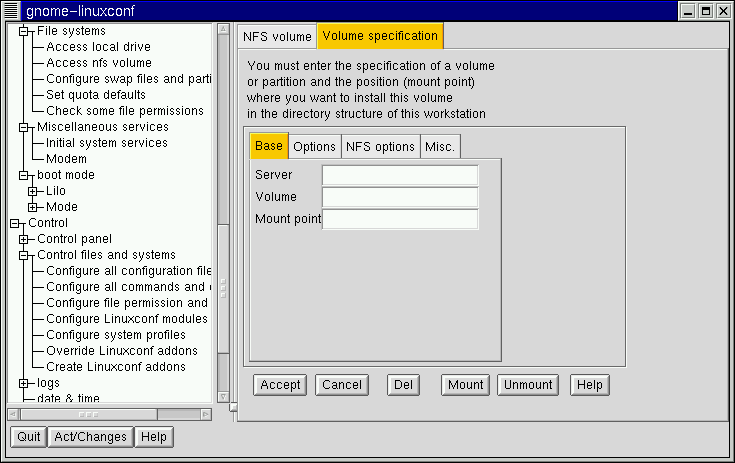 This is all you need to get the mount created. Linuxconf will update your /etc/fstab file accordingly. If you are aware of additional requirements, please read the help file on the Volume specification screen and see the mount man page for more information.