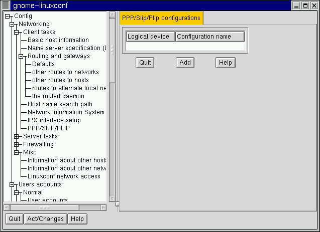 Initially there won't be any configurations specified. When you select Add you will be given a choice between PPP, SLIP and PLIP.