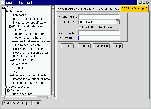 The login name is the one for the PPP account. The password you enter will be shown in plain text, so be careful who you have around when you enter it! If you will be using PAP authentication, check the box; when you've entered the other required information, select the Customize button at the bottom of the screen.