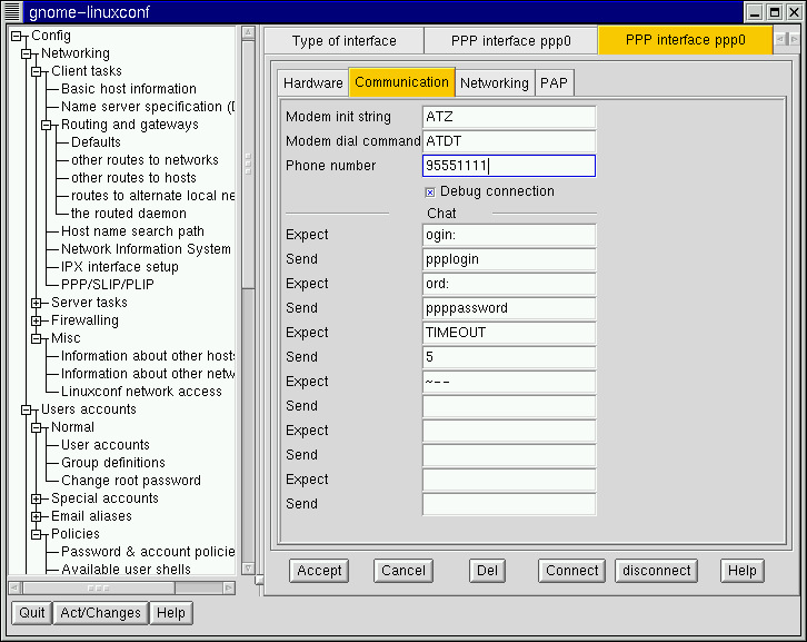 This will open the appropriate interface screen for your configuration. If you wish to delete the configuration, select Del at the bottom of the screen. The Modem port is on the Hardware tab and is a drop down menu. If you want to change the other settings you entered when you originally created the configuration, select the Communication tab. The first Send field contains your login, and the next Send field contains your password. The Expect fields correspond to the login: and password: prompts, which explains the ogin: and ord: entries.