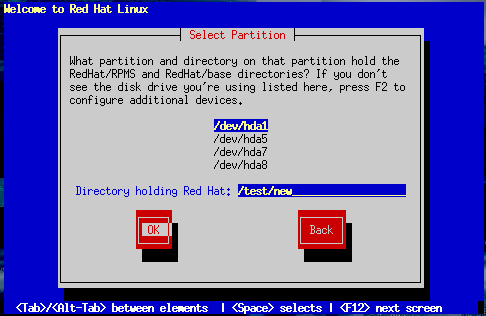 Enter the device name of the partition containing the RedHat directory tree. There is also a field labelled Directory holding Red Hat. If the RedHat directory is not in the root directory of that partition, enter the path to the RedHat directory (for example, if the RedHat directory is at /test/new/RedHat, you would enter /test/new).