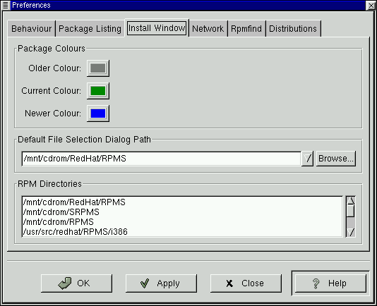 In Install Window,, you can specify the path through which Gnome-RPM can find new RPMs on your system. Refer to Figure 7-6 for an example of this dialog. If you're using your Red Hat Linux CD-ROM, this path will probably be