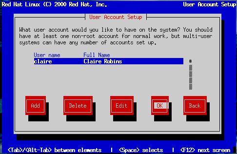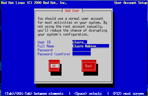 Next, you can create a user account for yourself which is for your everyday use (as in Figure 10-31). If you do not create a user account, after installation you'll have to log in as the root user (also known as the superuser). Root has complete access to the entire system. Logging in as the root user is best done only to perform system maintenance or administration. For instructions on how to create or modify user accounts after installation, refer to Chapter 3 or the Getting Started chapter in the Official Red Hat Linux Getting Started Guide.