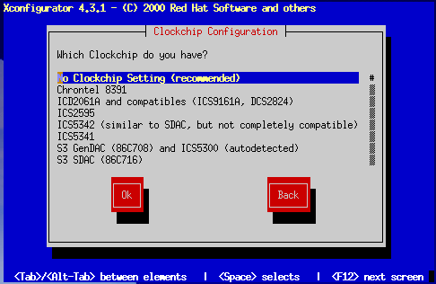 If your video card supports a video clockchip (if it has one). The recommended choice is No Clockchip Setting, since XFree86 can automatically detect the proper clockchip in most cases.