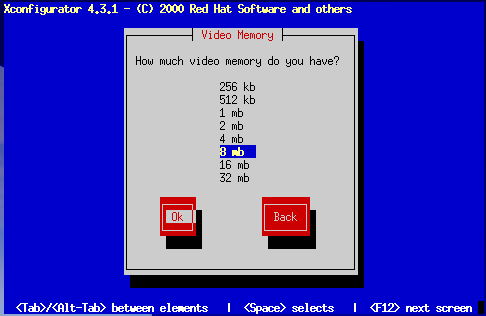 The amount of video memory installed on your video card. If you are not sure, consult the documentation accompanying your video card. Choosing more memory than is present in your card will not damage it, but may cause the XFree86 server to start incorrectly.