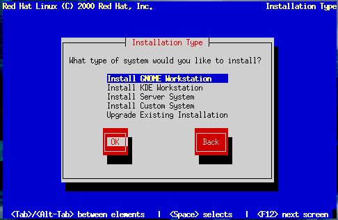 Install GNOME Workstation -- Install on a system that will be used primarily as a workstation. Load the GNOME GUI and configure the system to start GNOME when the system boots. The installation program deletes all data in any existing Linux partitions, decides how to partition the disk for the new version, and chooses which software packages to load.