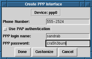 Adding a PPP interface can be as simple as supplying the phone number, login name and password in the Create PPP Interface dialog shown in Figure 3-34. If you must use PAP authentication for your PPP connection, choose Use PAP authentication. In many cases some degree of customization will be needed to establish a PPP connection. Choosing the Customize button will allow you to make changes to the hardware, communication, and networking settings for the PPP interface.