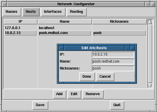 In the Hosts management panel you have the ability to add, edit, or remove hosts from the /etc/hosts file. Adding or editing an entry involves identical actions. An edit dialog box will appear, simply type the new information and click Done when you are finished. See Figure 3-31 for an example.