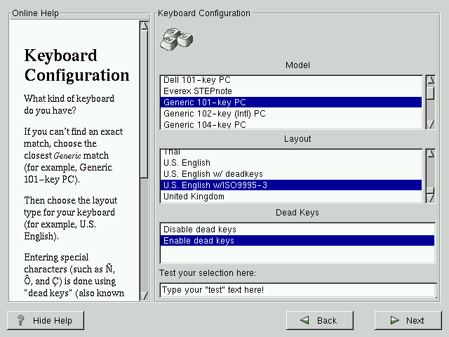 To change your keyboard type post-installation, become root and use the /usr/sbin/kbdconfig command, or you can type setup as root at the shell prompt (in other words, [root@yourmachine currentdirectory]#). [1] |