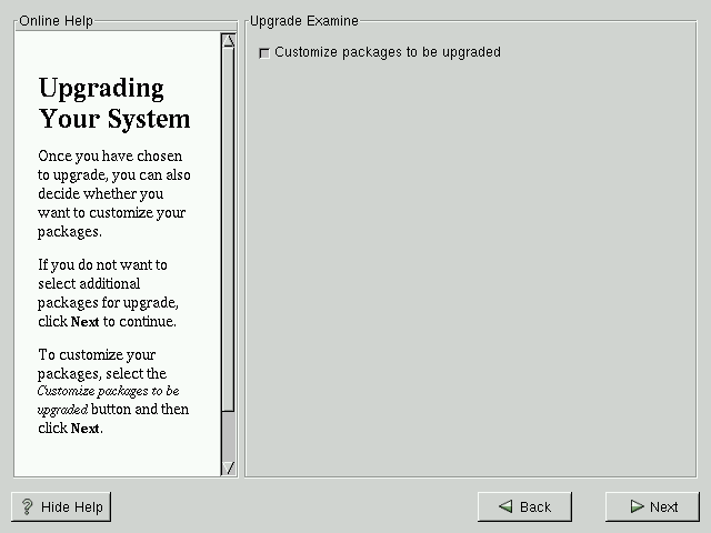 To let the installation program do the upgrade process for you, make sure the Customize packages to be upgraded is not selected and click Next (see the section called Upgrading Packages).