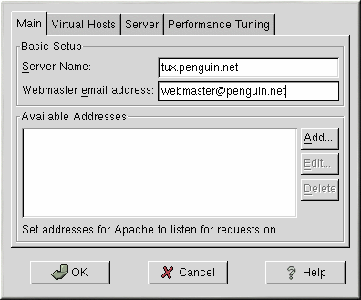 Apache Configuration Tool allows you to configure the /etc/httpd/conf/httpd.conf configuration file for your Apache Web server. It does not use the old srm.conf or access.conf configuration files; leave them empty. Through the graphical interface, you can configure Apache directives such as virtual hosts, logging attributes, and maximum number of connections.