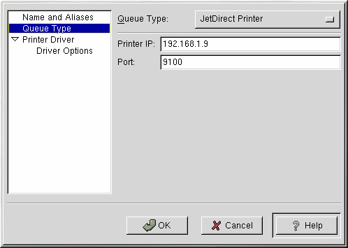 Click Queue Type from the left side menu and choose JetDirect Printer from the Queue Type menu.