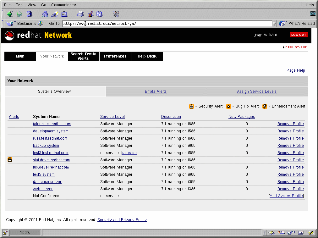 After you register a system with Red Hat Network, your System Profile is used to deliver software packages, as soon as they are released by Red Hat, to you. Red Hat Network only informs you about Errata Alerts that are relevant to your registered system. The status of your system can be viewed through the Red Hat Update Agent or at http://www.redhat.com/network/.