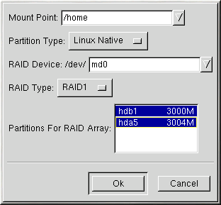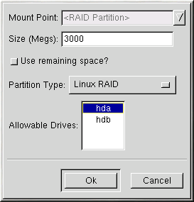 If you are making a RAID partition of /boot, you must choose RAID level 1 and it must use one of the first two drives (IDE first, SCSI second). If you are not creating a RAID partition of /boot, and you are making a RAID partition of /, it must be RAID level 1 and it must use one of the first two drives (IDE first, SCSI second). |