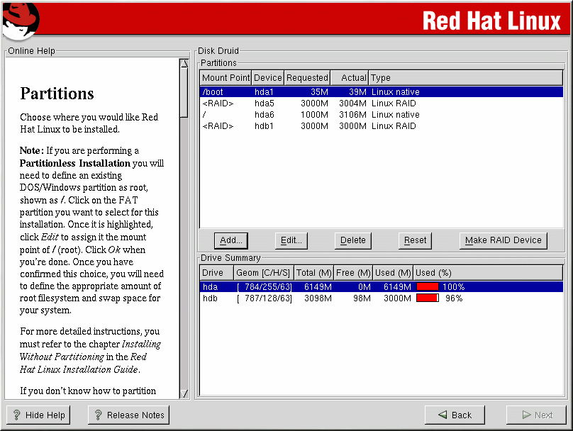 Read the Appendix on RAID in the Official Red Hat Linux Reference Guide first to tell about RAID and the differences between Hardware RAID versus Software RAID.