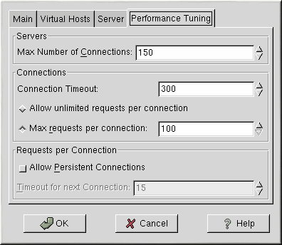 Click on the Performance Tuning tab to configure the maximum number of child server processes you want and to configure the Apache options for client connections. The default settings for these options are appropriate for most situations. Altering these settings may affect the overall performance of your Web server.
