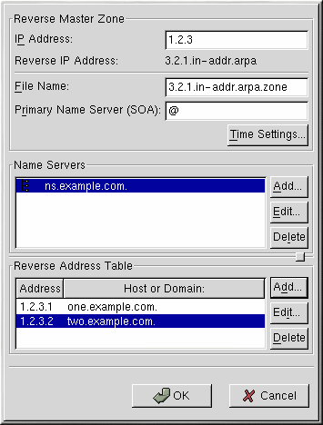 Name Servers — Add, edit, and delete name servers for for the reverse master zone. At least one name server is required.