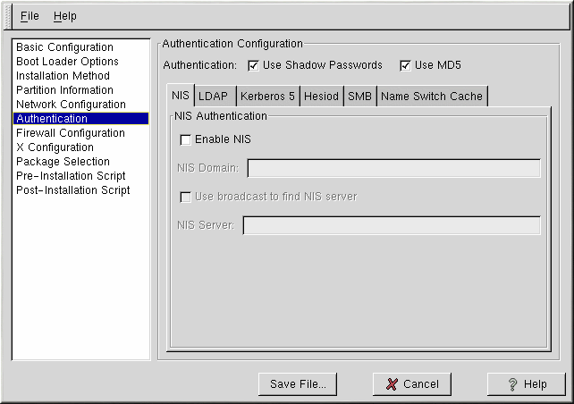 In the Authentication section, select whether to use shadow passwords and md5 encryption for user passwords. These options are highly recommended and chosen by default.
