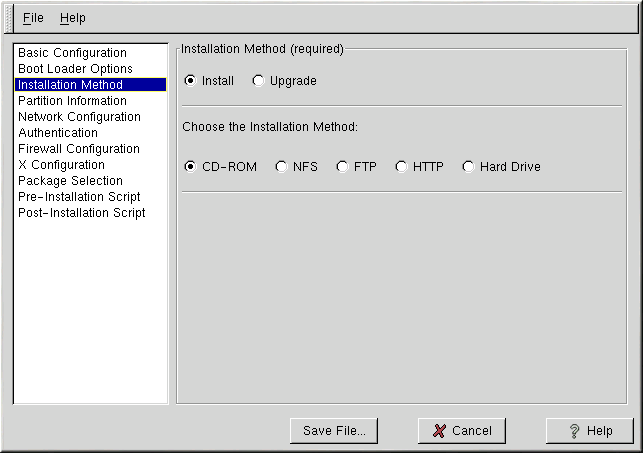 The Installation Method page allows you to choose whether you want to perform a full installation or an upgrade. If you choose upgrade, the Partition Information and Package Selection pages will be disabled. They are not supported for kickstart upgrades.