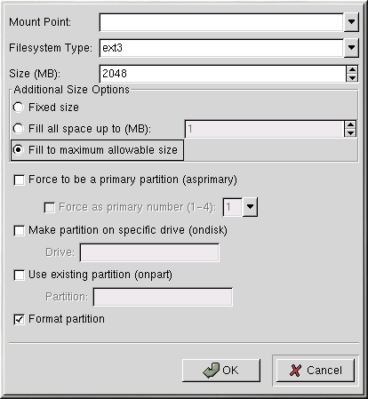 To create a partition, click the Add button. The Partition Options window shown in the section called Creating Partitions will appear. Choose mount point, filesystem type, and partition size for the new partition. Optionally, you can also choose from the following:
