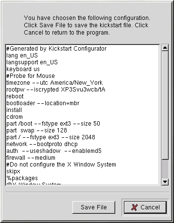 After you have finished choosing your kickstart options, click the Save File button. A dialog box similar to Figure 2-15 will appear to allow you to review your choices before saving the file.