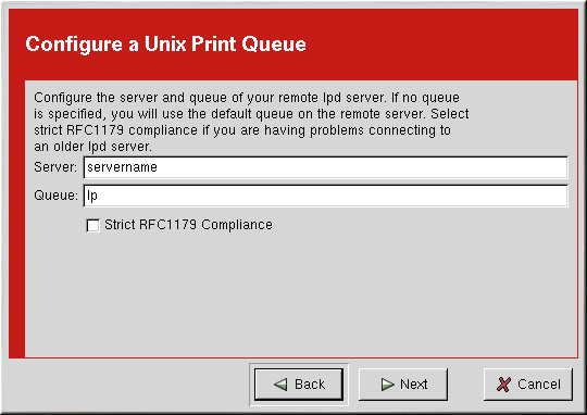 Queue — The remote printer queue. The default printer queue is usually lp.