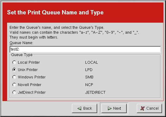 You will then see the screen shown in Figure 21-5. Enter a unique name for the printer in the Queue Name text field. The printer name can not contain spaces and must begin with a letter a through z or A through Z. The valid characters are a through z, A through Z, 0 through 9, -, and _.