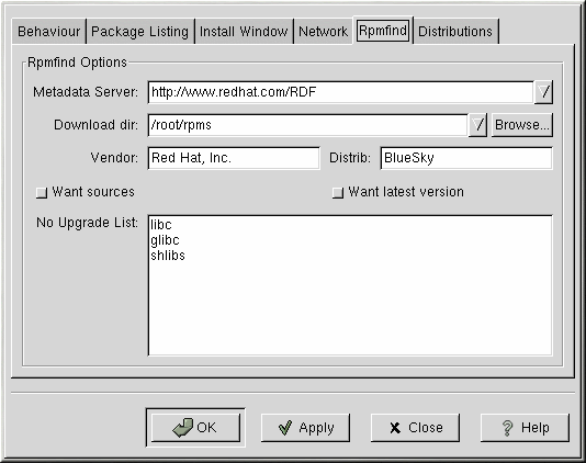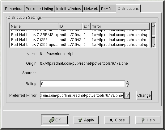 In Distribution Settings, you can set the options for choosing the most appropriate package out of the selections Rpmfind returns, as well as which mirror you would like to use. The higher the rating you indicate for your selection (as shown in Figure 26-8), the higher the priority it will receive; a lower rating (such as "-1") will specify that packages not be recommended.