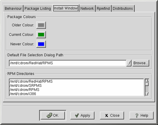 In Install Window,, you can specify the path where Gnome-RPM can find new RPMs on your system. Refer to Figure 26-5 for an example of this dialog. If you're using your Red Hat Linux CD-ROM, this path will probably be