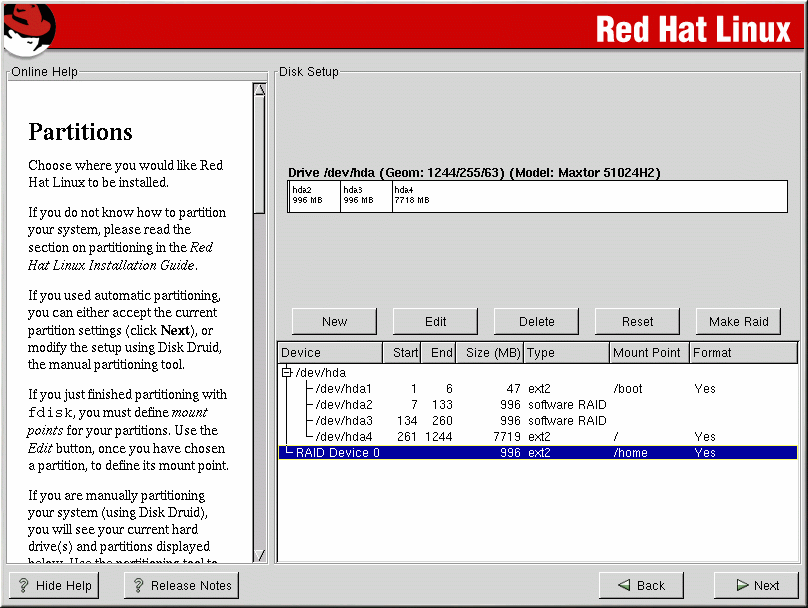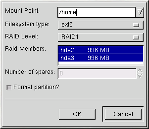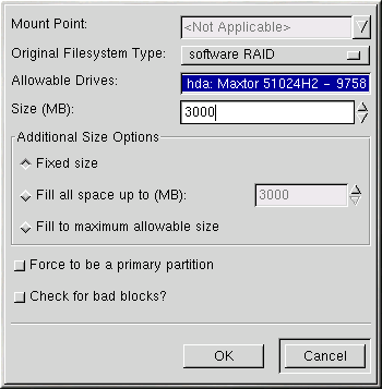 If you are making a RAID partition of /boot, you must choose RAID level 1 and it must use one of the first two drives (IDE first, SCSI second). If you are not creating a RAID partition of /boot, and you are making a RAID partition of /, it must be RAID level 1 and it must use one of the first two drives (IDE first, SCSI second). |