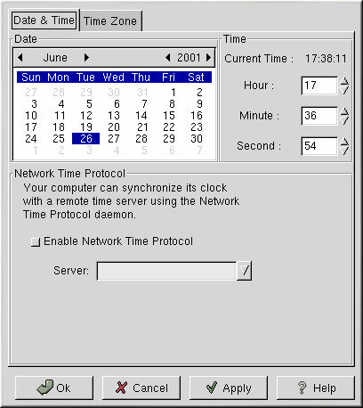 Clicking the Apply button will apply any changes that you have made to the date and time, the NTP daemon settings, and the time zone settings. Clicking the Ok button will apply the changes and then exit the program.