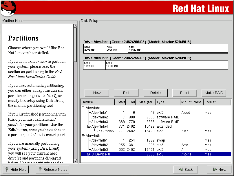 If you are making a RAID partition of /boot, you must choose RAID level 1 and it must use one of the first two drives (IDE first, SCSI second). If you are not creating a RAID partition of /boot, and you are making a RAID partition of /, it must be RAID level 1 and it must use one of the first two drives (IDE first, SCSI second). |