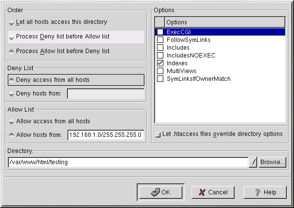 To specify options for specific directories, click the Add button beside the Directory list box. The window shown in Figure 13-7 appears. Enter the directory to configure in the Directory text field at the bottom of the window. Select the options in the right-hand list, and configure the Order directive with the left-hand side options. The Order directive controls the order in which allow and deny directives are evaluated. In the Allow hosts from and Deny hosts from text field, you can specify one of the following: