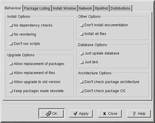 Under the Behaviour tab, you will find a number of options for configuring the way Gnome-RPM installs, uninstalls and upgrades packages. The Behaviour tab is divided into five sections: Install Options, Upgrade Options, Other Options, Database Options and Architecture Options. Note that by default these boxes are not selected (see Figure 26-4).