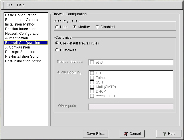 The Firewall Configuration window is identical to the screen in the Red Hat Linux installation program and provides the same functionality. Choose between High, Medium, and Disabled security levels. Refer to the Official Red Hat Linux Installation Guide for detailed information about these security levels.