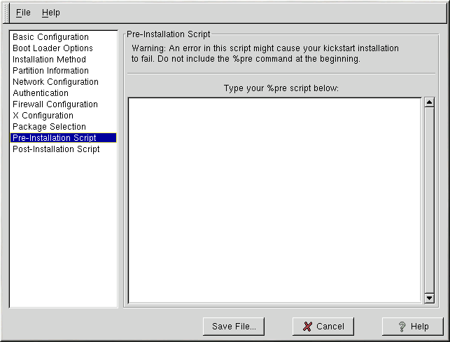 You can add commands to run on the system immediately after the kickstart file has been parsed and before the installation begins. If you have configured the network in the kickstart file, the network is enabled before this section is processed. If you would like to include a pre-installation script, type it in the text area.