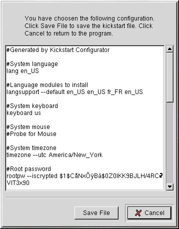 After you have finished choosing your kickstart options, click the Save File button. A dialog box similar to Figure 2-15 will appear to allow you to review your choices before saving the file.