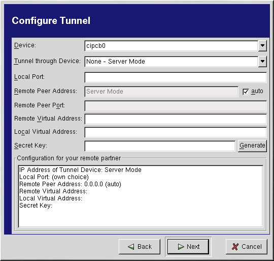 CIPE stands for Crypto IP Encapsulation. It is used to configure an IP tunneling device. For example, CIPE can be used to grant access from the outside world into a Virtual Private Network (VPN). If you need to setup a CIPE device, contact your system administrator for the correct values.
