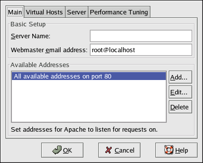 The HTTP Configuration Tool allows you to configure the /etc/httpd/conf/httpd.conf configuration file for the Apache HTTP Server. It does not use the old srm.conf or access.conf configuration files; leave them empty. Through the graphical interface, you can configure directives such as virtual hosts, logging attributes, and maximum number of connections.
