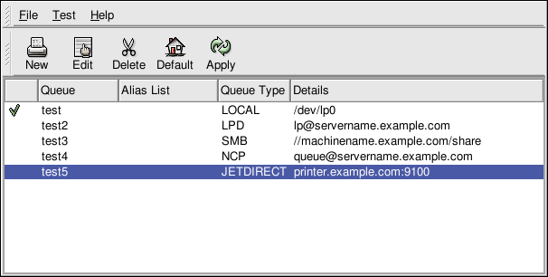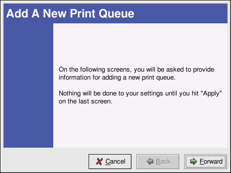 If you add a new print queue or modify an existing one, you need to restart the printer daemon (lpd) for the changes to take effect. |