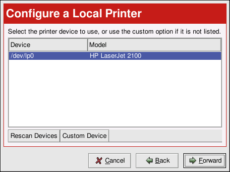 Printer Configuration Tool attempts to detect your printer device and model as shown in Figure 26-4. If your printer device is not shown, click Custom Device. Type the name of your printer device and click OK to add it to the printer device list. A printer device attached to the parallel port is usually referred to as /dev/lp0. A printer device attached to the USB port is usually referred to as /dev/usblp0. If your printer model does not appear, you will be given the opportunity to select it in the next step. Click Next to continue.