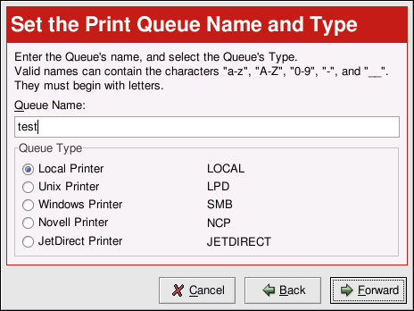 You will then see the screen shown in Figure 26-3. Enter a unique name for the printer in the Queue Name text field. This can be any descriptive name for your printer. The printer name cannot contain spaces and must begin with a letter a through z or A through Z. The valid characters are a through z, A through Z, 0 through 9, -, and _.